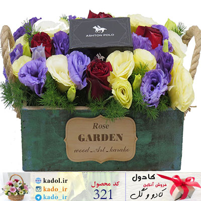 این باکس زیبای چوبی با گل های رنگارنگ خود ، جعبه ی کادو را در برگرفته است.